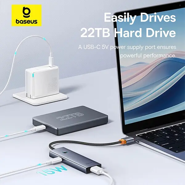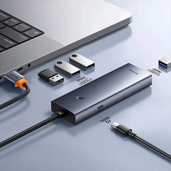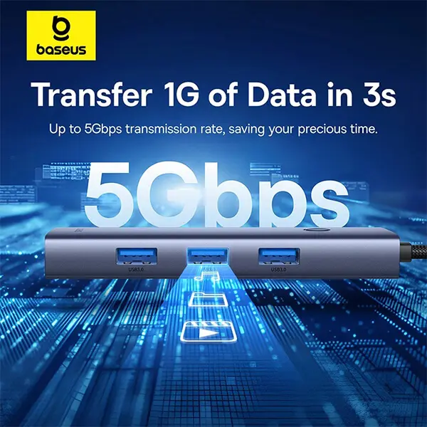 The Baseus BS-OH108U 4 Port USB HUB delivers up to 5Gbps data transfer speed, ensuring stable and efficient connectivity for flash drives, hard disks, keyboards, mice, and printers. With its space grey aluminum alloy body, compact form, and durable 15cm cable, this hub blends style, durability, and portability for everyday use.