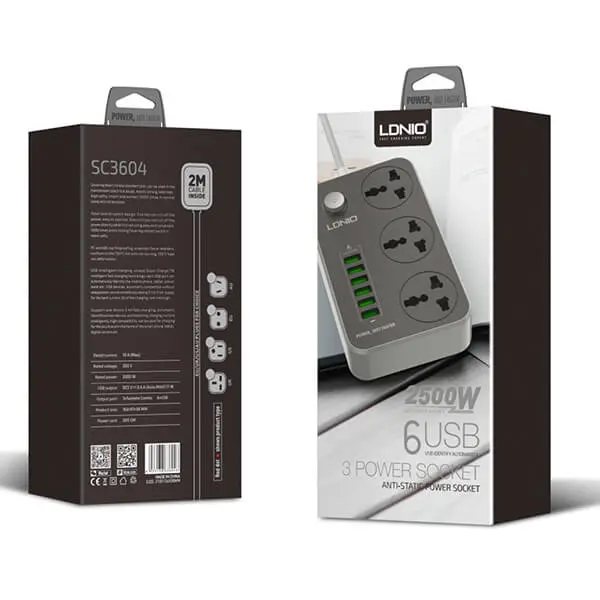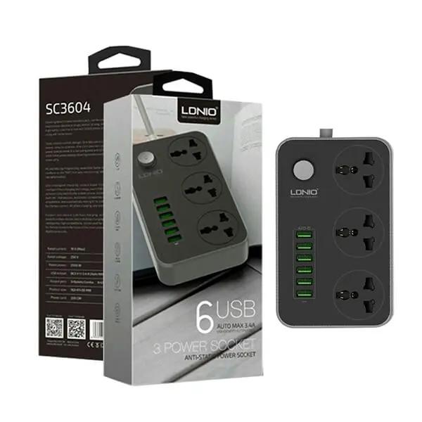 Stay powered and organized with the LDNIO 3 Power Socket Extension with 6 USB Ports SC3604, a multifunctional power solution designed for modern homes and offices. With 3 universal AC outlets and 6 high-speed USB ports, this smart extension strip lets you charge and power multiple devices simultaneously with safety and efficiency.